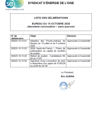 Tableau des délibérations - Bureau syndical du 15/10/2025