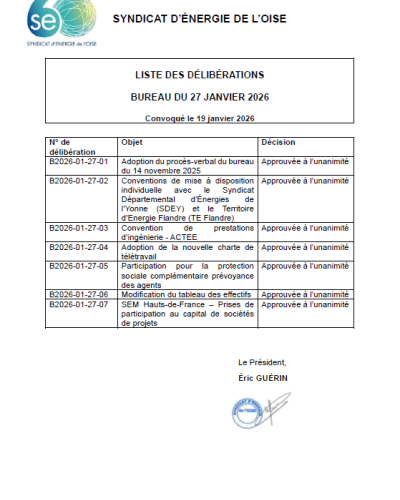 Tableau des délibérations - Bureau syndical du 27/01/2026