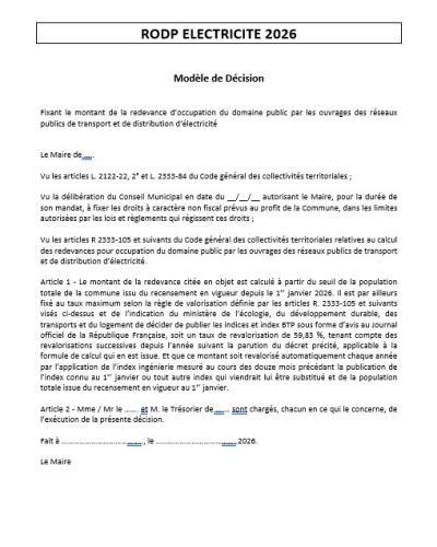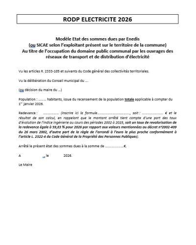 Modèle ETAT des sommes dues - Electricité Fichier rodp_2026_-_modele_etat_sommes_dues_par_enedis.doc (.doc - 28 Ko) Modèle DECISION - Electricité Fichier rodp_2026_-_modele_decision_rodp_electricite.doc (.doc - 28 Ko) Modèle DELIBERATION - Electricité Fichier rodp_2026_-_modele_delib_rodp_electricite.doc (.doc - 27 Ko) RODP - Fiche pratique - Electricité Fichier rodp_2026_-_fiche_pratique_-_rodp_electricite.pdf (.pdf - 264.28 Ko)