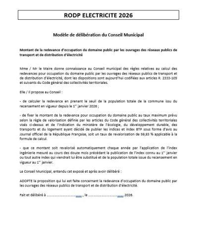 Modèle DELIBERATION - Electricité Fichier rodp_2026_-_modele_delib_rodp_electricite.doc (.doc - 27 Ko) RODP - Fiche pratique - Electricité Fichier rodp_2026_-_fiche_pratique_-_rodp_electricite.pdf (.pdf - 264.28 Ko)